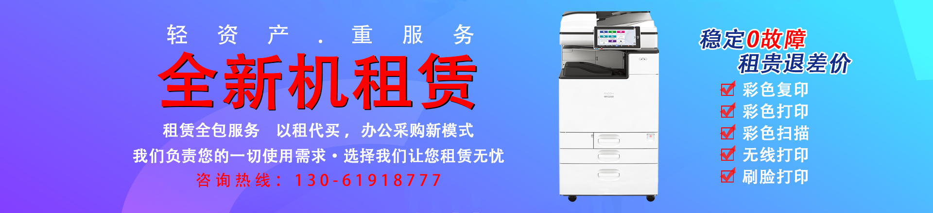 很多企業(yè)用戶在自己購買復印機,還是租賃復印機的時候,顯得搖擺不定。那兩者間到底有什么區(qū)別?上海宇川作為上海復印機租服務商。由我們?yōu)榇蠹以敿氈v解兩者間的區(qū)別。1、辦公耗材:購買復印機后,還需要購買其他配套產品,另外還要自學如何更換耗材和維護機器。租賃復印機除了打印用紙以外,其他耗材均由復印機服務商來定期更換。2、技術員上門服務:購買復印機后,如果出現問題,需要聯系專門的售后,但是這類的售后都是有償上門服務。租賃復印機由專業(yè)的售后團隊免費上門服務,保障售后。3、設備折舊風險:購買復印機后,使用一段時間,機器的功能需要升級、設備容易貶值。租賃復印機由多種機型任意選擇,可以使用新機型,選擇余地大。綜上所述:復印機租賃性價比較高,省錢、省時、